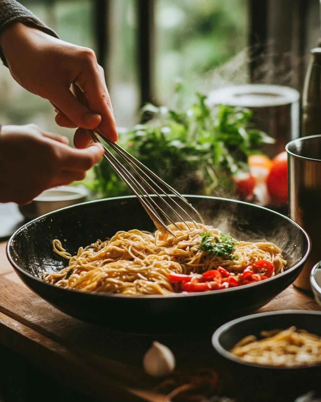 Presenting your Easy Chicken Lo Mein with Garlic Ginger Sauce beautifully enhances the dining experience.